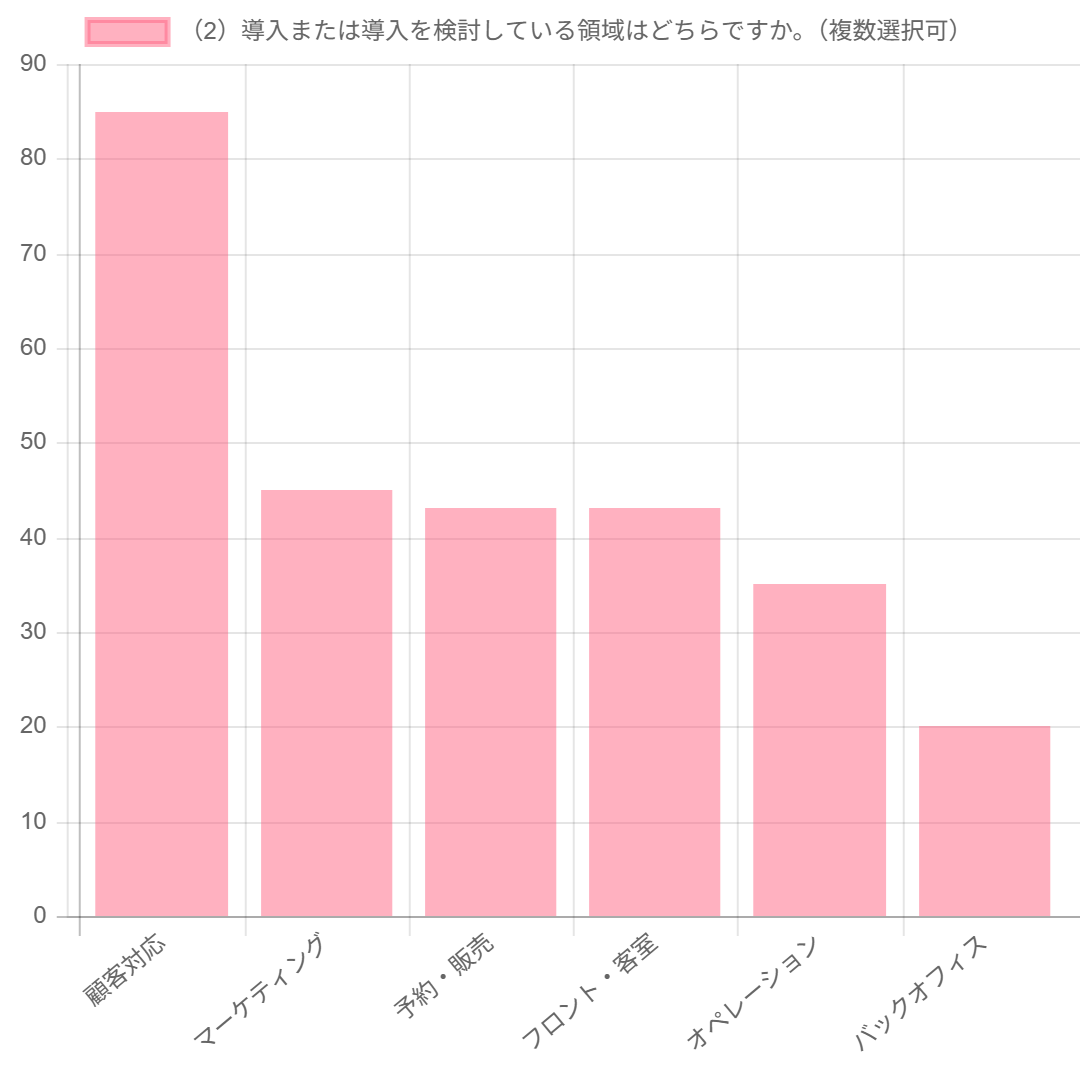 ・「予約・販売」、「マーケティング」、「フロント・客室」は40%台。「予約・販売」はレベニューマネジメント、需要予測等に活用され、「マーケティング」はレビューやSNS分析から改善点を抽出する動きが広がっています。「フロント・客室」はチェックインの効率化や館内案内の多言語化など、現場運用の負荷低減に直結するテーマが重視されている様子がうかがえます。