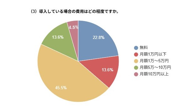 「月額1万~5万円」が45.5%と最も高く、次いで「無料」が22.8%。「月額1万円以下」と「月額5万~10万円」はいずれも13.6%、「月額10万円以上」は、導入していると回答した22施設のうち1施設(4.5%)という結果となりました。
