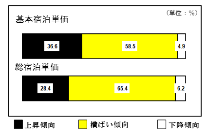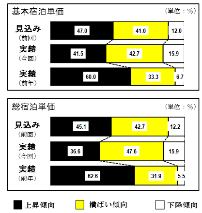 基本宿泊単価の「上昇傾向」は、見込みを下回って41.5%となりました。前年実績と比べると、20ポイント近く下がる結果となりました。総宿泊単価においてはさらに顕著で見込みを8.5ポイント下回りました。