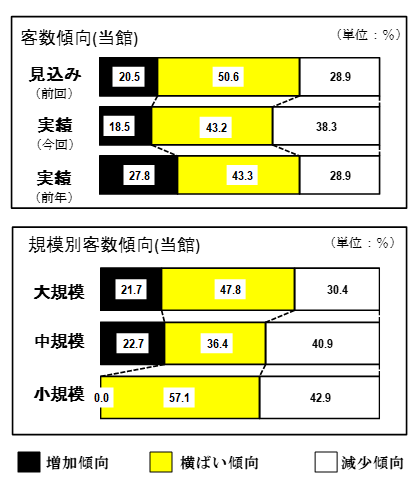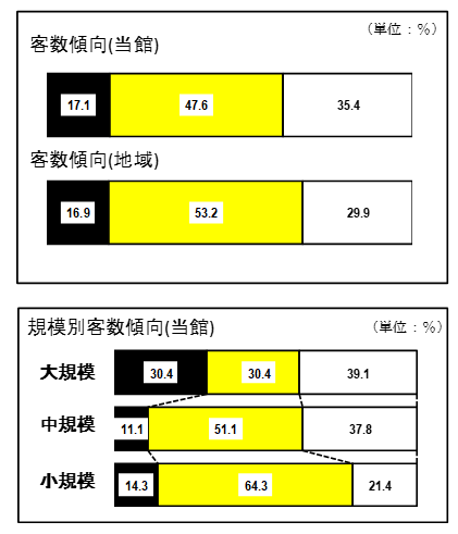規模別の客数傾向(当館)では、大規模施設では3分化したものの、中・小規模では「横ばい傾向」が過半数を超える結果となりました。