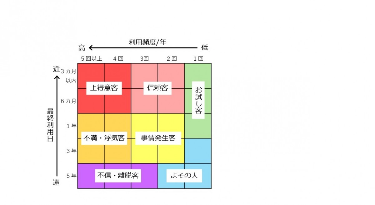 これはひとつの例なので、最終利用日や利用回数をどこで区切るか、またどのゾーンをどのような顧客として位置付けるかは、それぞれの状況に合わせてご判断いただきたい。