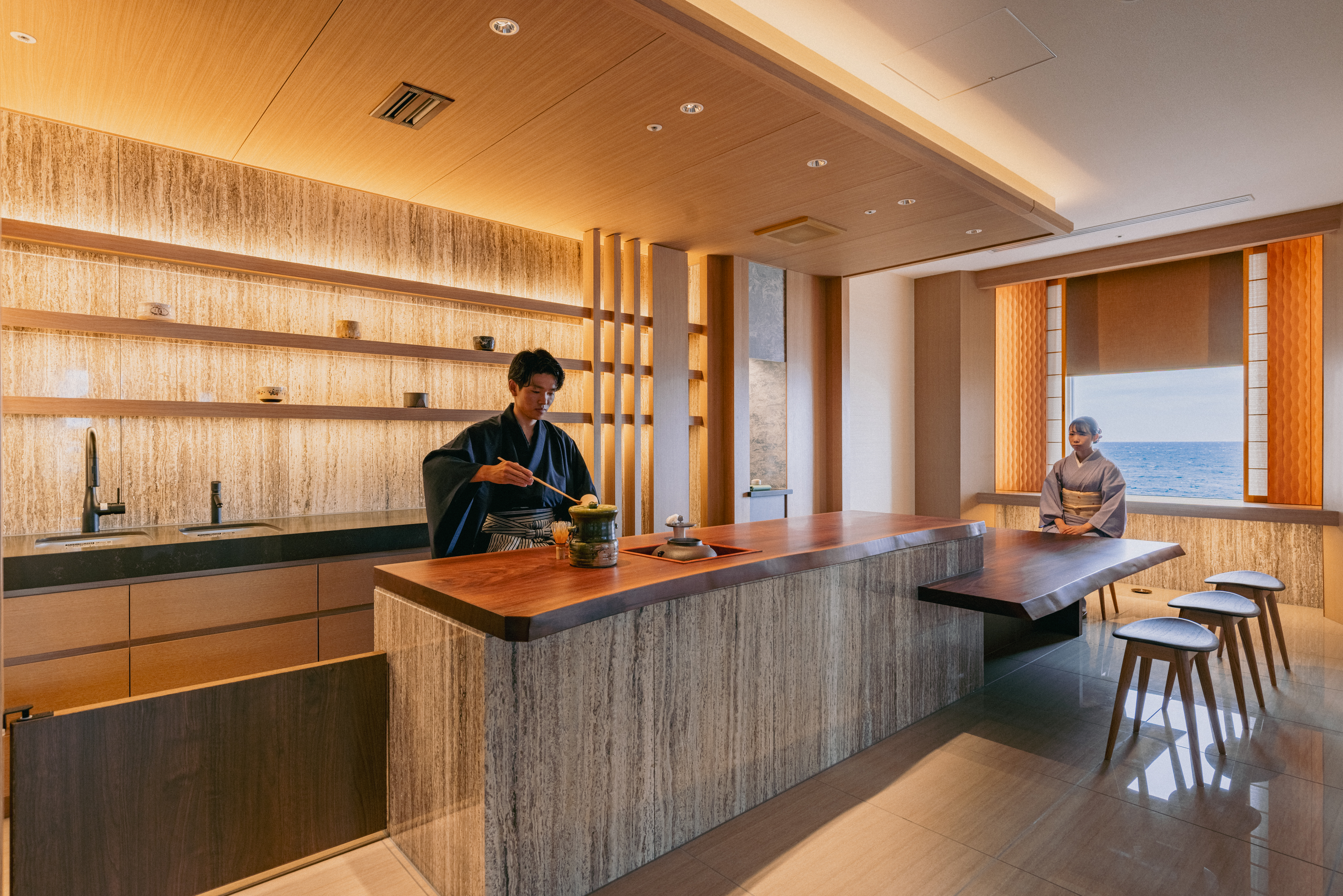 前にはクラフトコーナーを設け、自然素材を使った季節ごとの体験を用意。また、ラウンジサービスとして、季節のスムージーや柚子ドリンク、七福茶、GODIVA のブランド豆を使った特製ブレンドコーヒーなども用意。これらにより、大人も子どもも楽しめる場として、館内の滞在価値を高めます。また、今回の改装にあわせて、食事処の改装や外壁改修も行っています。